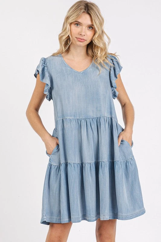 The V-Neck Ruffled Cap Sleeve Mini Dress is a charming and feminine choice for a stylish outfit. The V-neckline adds a touch of elegance, while the ruffled cap sleeves provide a playful and romantic flair. Perfect for various occasions, this dress offers a flattering silhouette with its mini length and delicate details.